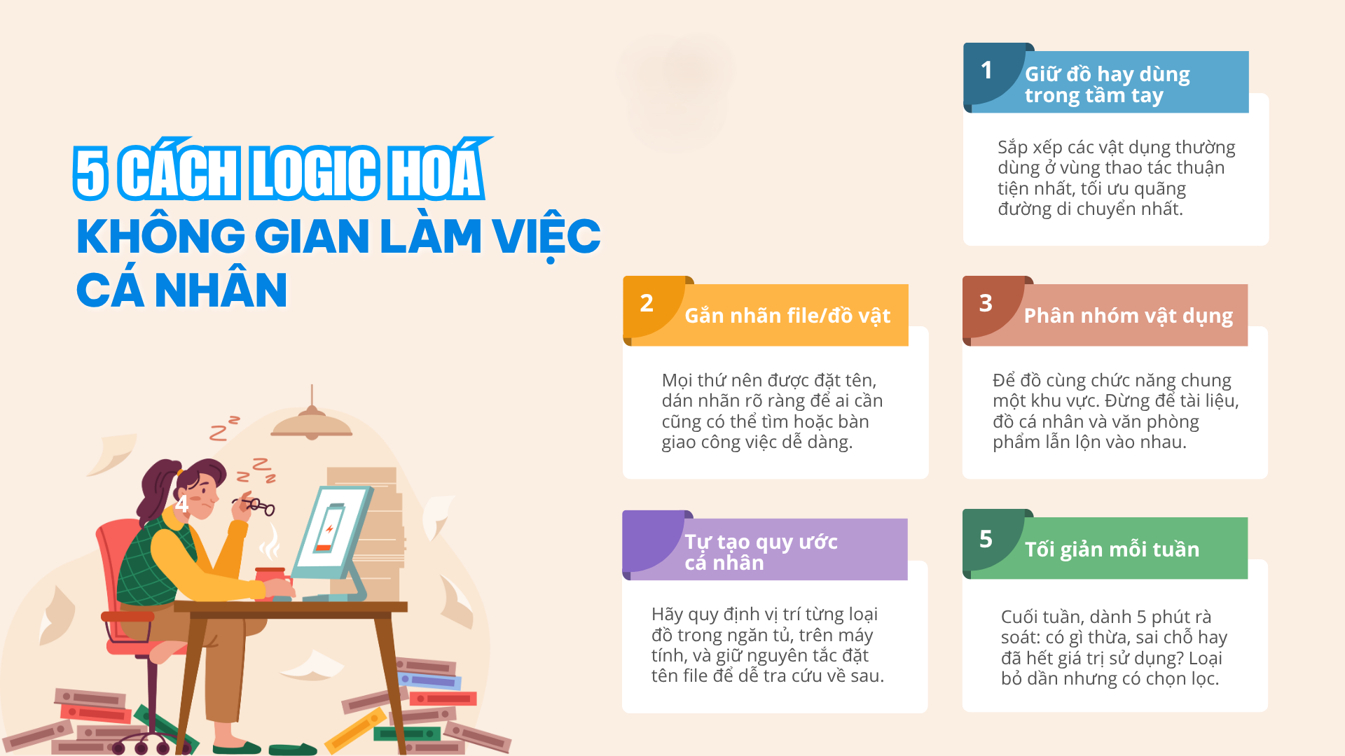 Giờ thì dừng lại khoảng 5 phút nhìn xung quanh, nếu bạn biết rõ từng món mình có để làm gì, sắp xếp đúng với tần suất sử dụng, gắn nhãn rõ ràng, các file online được tổ chức logic, đưa cho ai cũng hiểu được cách dùng – thì bạn đã là một 5S-er thực thụ rồi đó!